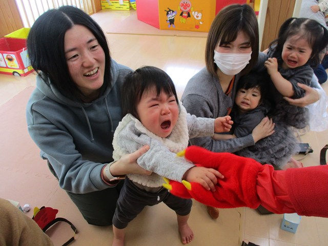 大声で泣いた子や怖いけど頑張って離れたところから豆を投げている子もいました。赤ちゃんも初めての鬼さんに目を丸くしていましたね。
